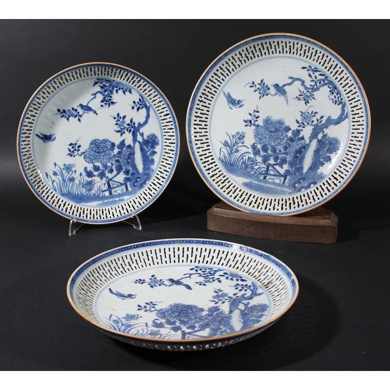 late 18th or 19th century, painted with a flowering garden scene inside a pierced border, diameter 27.5cm and 24.5cm (3)