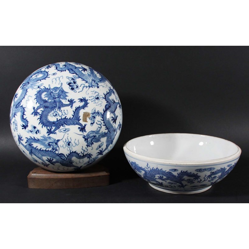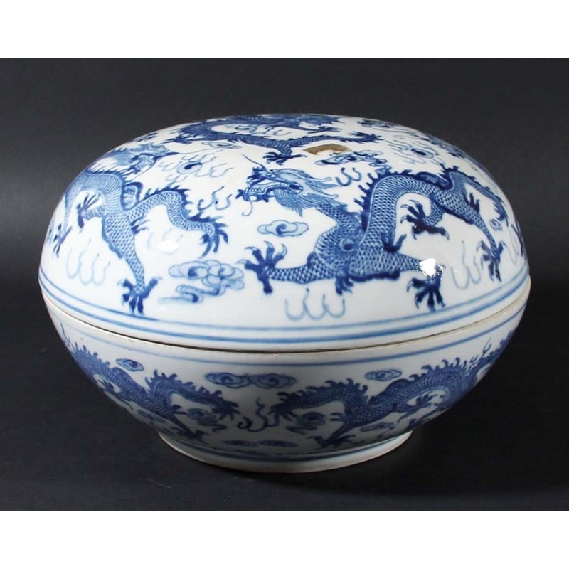 CHINESE BLUE AND WHITE BOX AND COVER, painted with scrolling dragons chasing flaming pearls, Guangxu style six character mark, diameter 28cm (2)