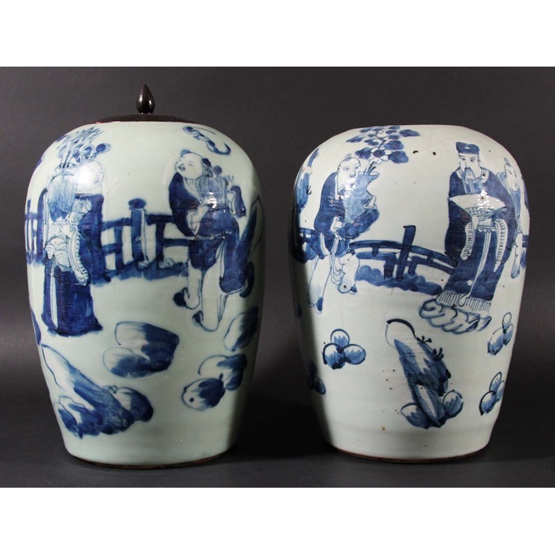 PAIR OF CHINESE VASES, of ovoid form, blue painted with figures in a rocky garden on a celadon ground, one with cover, height excluding cover 29cm (2)