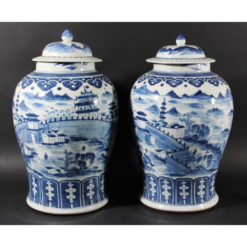 PAIR OF CHINESE BLUE AND WHITE VASES AND COVERS,