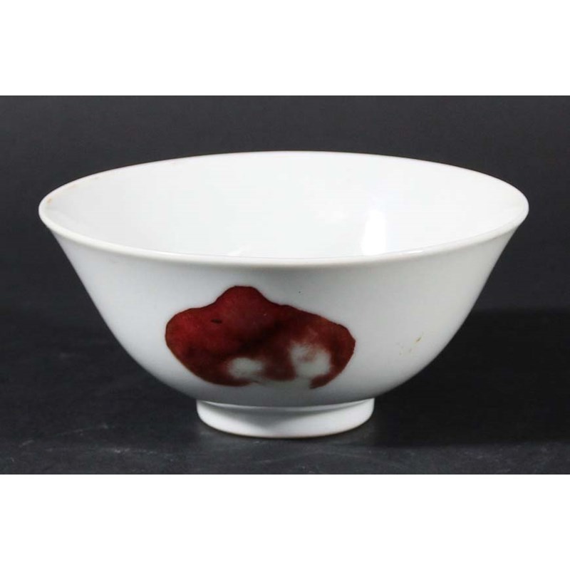 CHINESE FOOTED BOWL, copper red decorated with a pomegranate and two peaches, Yongzheng style four character mark, diameter 11cm