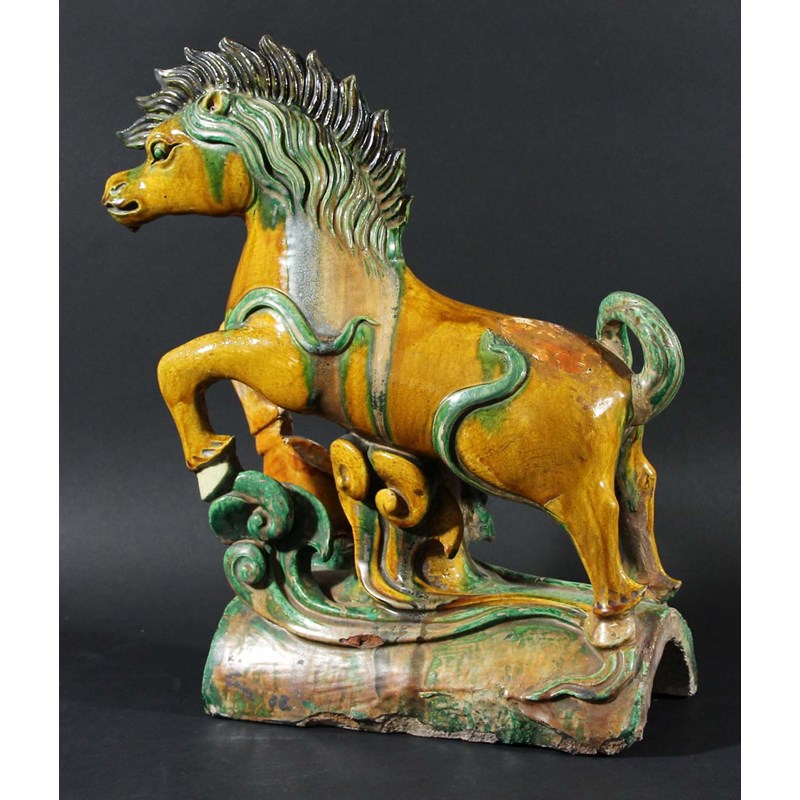 CHINESE SANCAI RIDGE TILE, modelled as a leaping horse supported by a scrolling wave, height 38cm