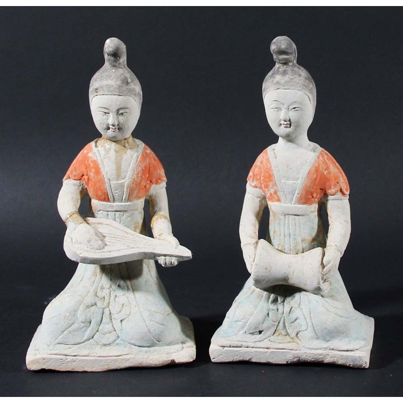 probably Han Dynasty, modelled as a girl, kneeling, playing a drum and guitar type instrument, black, orange and turquoise pigmentation, height 21cm (2)
