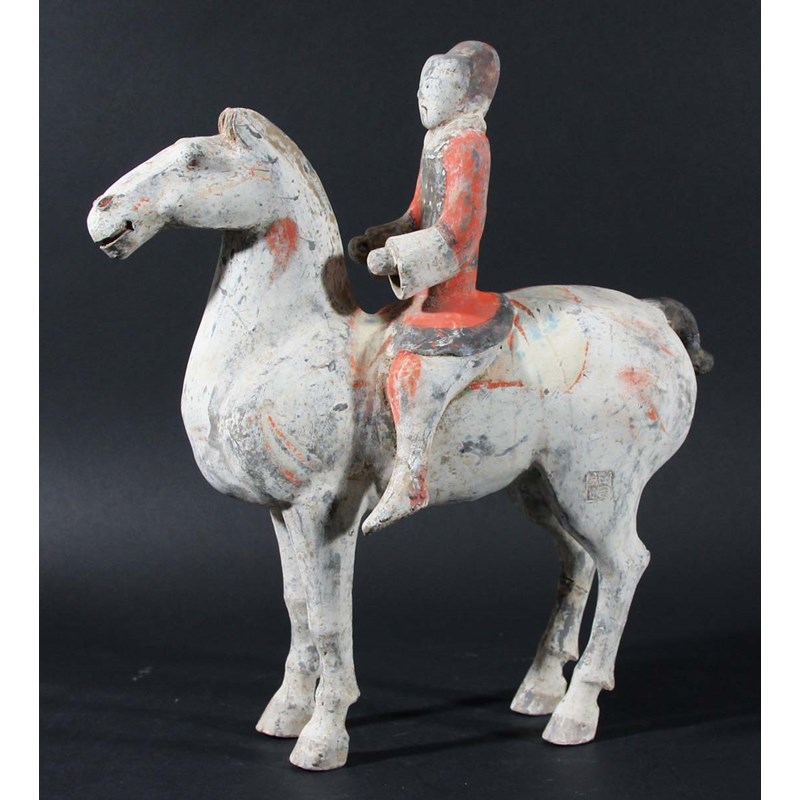probably Han Dynasty, the horse standing four square, its rider in a coloured outfit, height 31cm, length 29cm