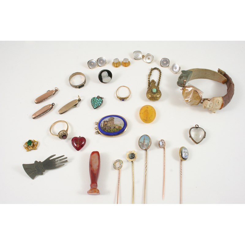 including an agate seal, a diamond stick pin and four other assorted stick pins, a micromosaic clasp depicting ruined buildings, mother-of-pearl and 18ct. gold dress studs and buttons, three small gold penknives, and various other items.