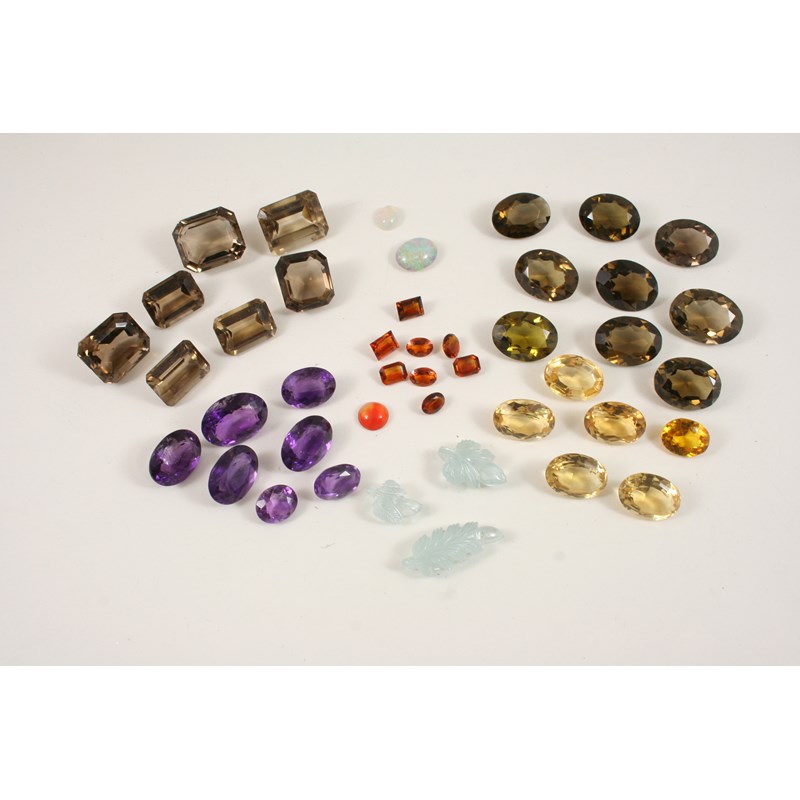 A QUANTITY OF LOOSE GEM STONES including citrine, amethyst, smoky quartz, and opal.