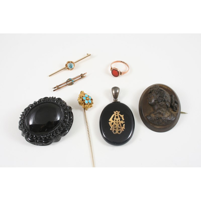 including a Victorian gold and turquoise set stick pin, with a compartment to the reverse containing hair, a zircon and gold bar brooch, a Victorian black onyx brooch, a Victorian black onyx pendant, embossed with gold initials, a 9ct. gold and carnelian signet ring, size P, a cameo brooch and a 9ct. gold bar brooch set with turquoise cabochons and small pearls.
