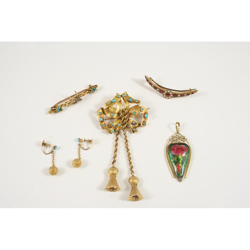 including a gold and turquoise set fancy bow brooch, a 15ct. gold turquoise and seed pearl set swallow brooch, a 9ct. gold ruby and pearl crescent brooch, an Art Nouveau enamel and gold pendant and a pair of gold and turquoise drop earrings.