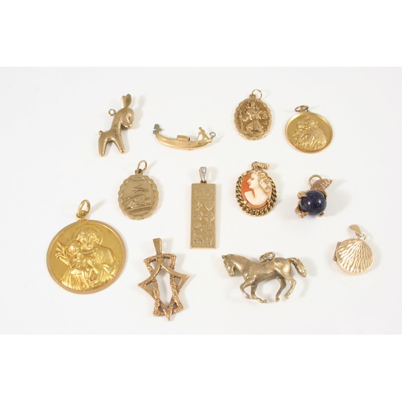 including a 9ct. gold pendant, embossed with various emblems, 5.9 grams, a 9ct. gold horse pendant, 5.7 grams, two 9ct. gold religious pendants, 7.8 grams, a carved shell cameo pendant and various other items.