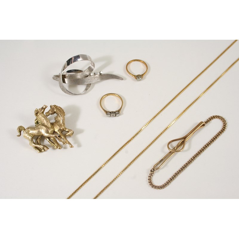 the 18ct. white gold swirl brooch is mounted with three circular diamonds, 6cm. long, together with a 9ct. gold double horse brooch, 12.7 grams, a diamond solitaire ring, set in 18ct. gold and platinum, size I, a diamond three stone ring, set in 18ct. gold, size I, an 18ct. gold chain necklace, 8.3 grams, and a 9ct. gold tie clip, 5.1 grams.