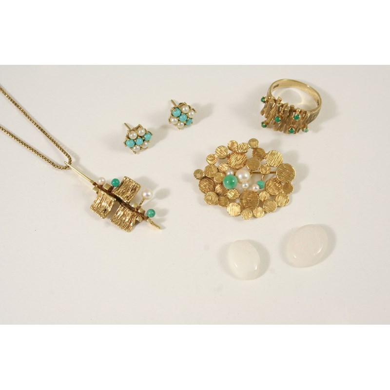 including a 9ct. gold openwork brooch mounted with cultured pearls and turquoise, a gold, turquoise and cultured pearl geometric design pendant, a 9ct. gold and turquoise ring, a pair of turquoise and cultured pearl stud earrings and two loose solid white opal cabochons.