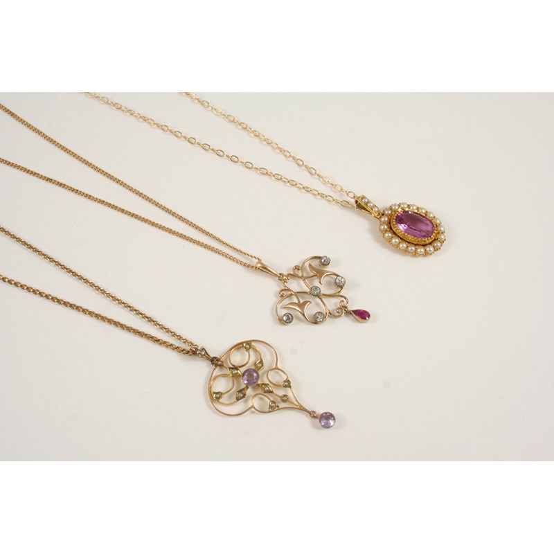 the 15ct. gold openwork design is mounted with rose-cut diamonds and suspends a ruby pear-shaped drop, 2.5cm. wide, on a 9ct. gold fine link chain, together with an Edwardian amethyst, pearl and gold openwork pendant, 4cm. long, on a 9ct. gold chain, a pink tourmaline, pearl and gold cluster pendant, 3cm. long, on a gold fine link chain and a 9ct. gold chain, 3.1 grams.
