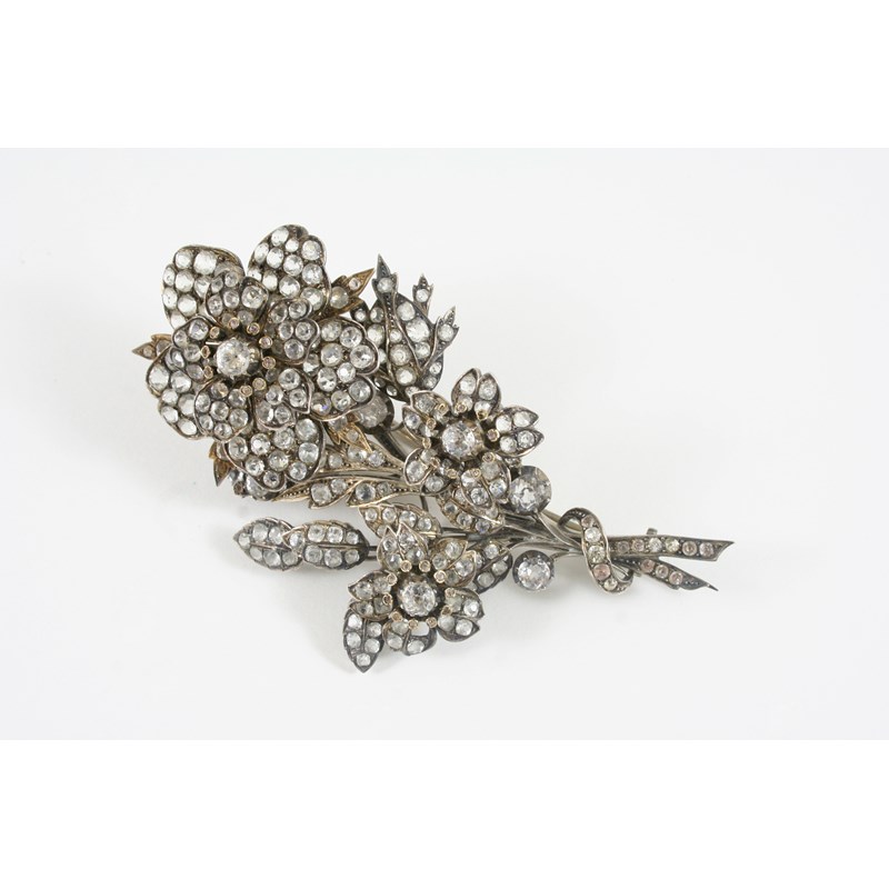 A LARGE PASTE SET FOLIATE SPRAY BROOCH set overall with graduated white paste stones, in silver, 11.0cm. long.