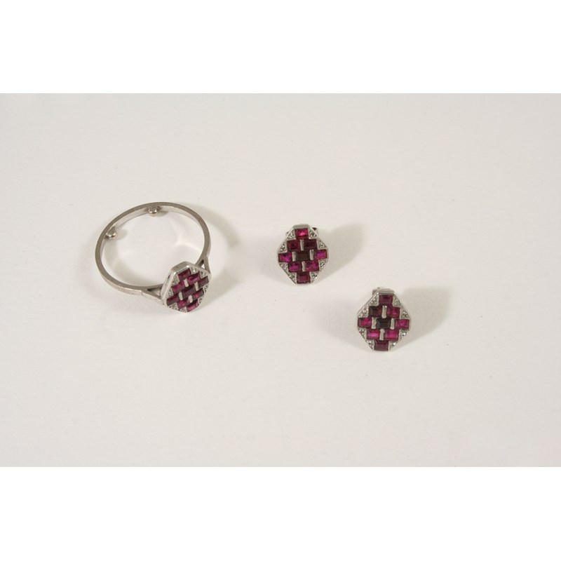 centred with nine rectangular-shaped rubies within a surround of small diamonds, size S, together with a pair of matching stud earrings.