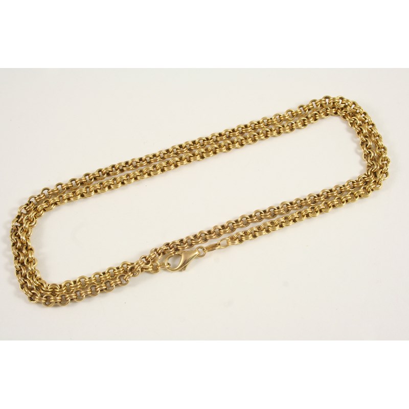 A 9CT. GOLD CHAIN NECKLACE formed with circular double links, 60cm. long, 12.7 grams.