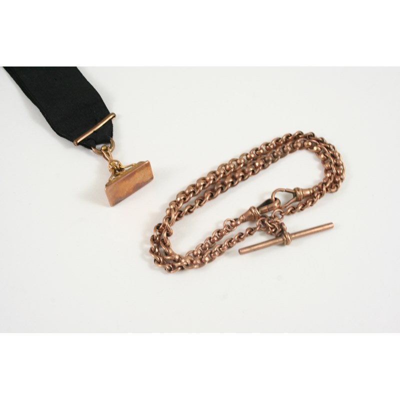 A 9CT. GOLD WATCH CHAIN with a 9ct. gold 't' bar, 39cm. long, 31 grams, together with a gold fob seal.