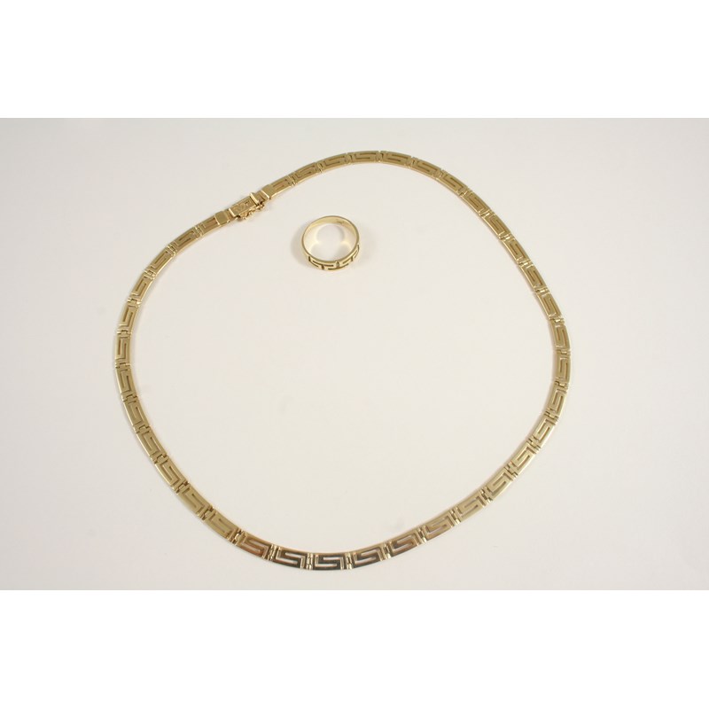 formed of openwork links of Greek key design, 45cm. long, 22.3 grams, together with a similar 14ct. gold ring, 3.7 grams, size Q.