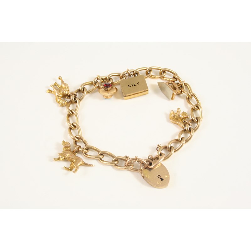 A 9CT. GOLD CURB LINK BRACELET mounted with assorted gold charms and with padlock clasp, 20cm. long, 39.3 grams.