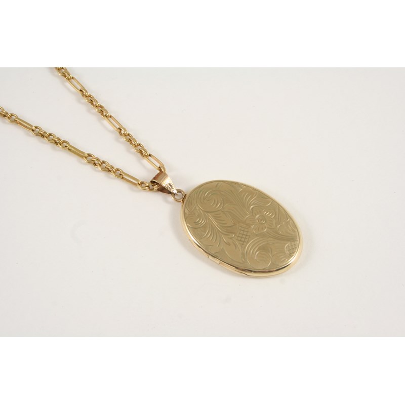 of oval-shape, with carved foliate decoration to front case, 4cm. long, on a 9ct. gold long and short link neckchain, total weight 24 grams.