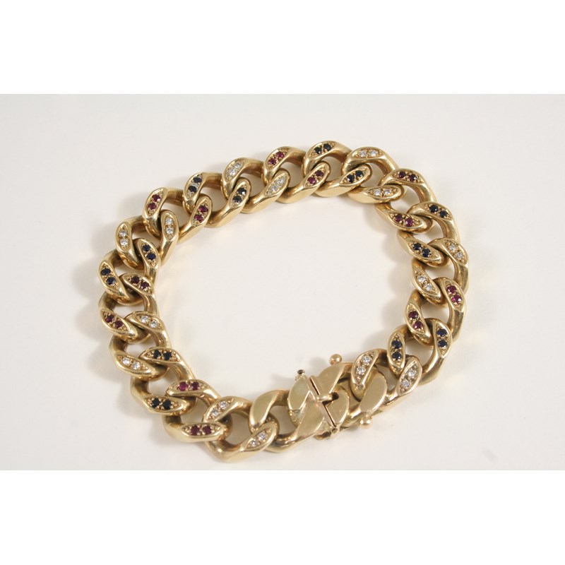 each link set alternately with circular-cut diamonds, rubies and sapphires, with concealed clasp, 22.5cm. long, 108 grams.