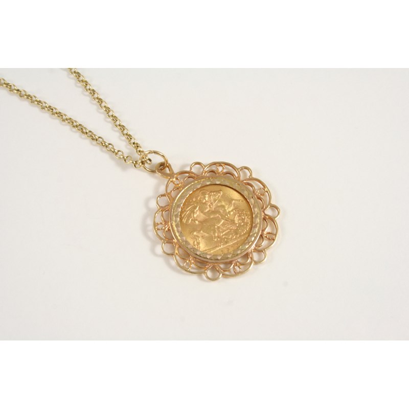 A GOLD HALF SOVEREIGN 1913, in a 9ct. gold pendant mount and on a 9ct. gold circular link chain, total weight 11.7 grams.