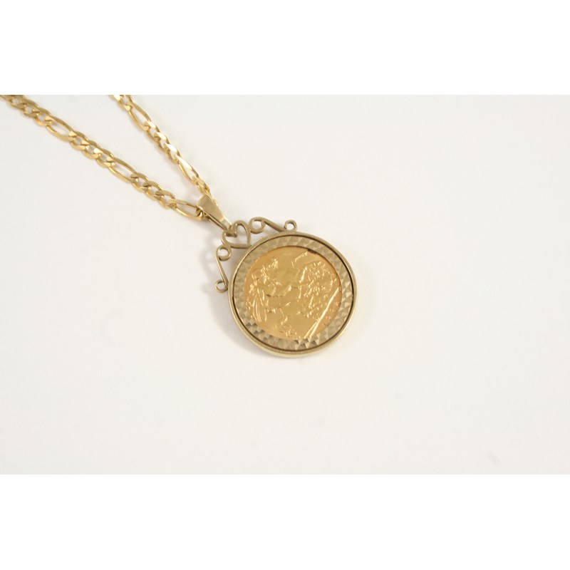 A GOLD HALF SOVEREIGN 1982, in a 9ct. gold pendant mount and on a 9ct. gold flat curb link neckchain, total weight 16.2 grams.