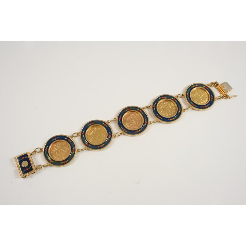 A GOLD HALF SOVEREIGN BRACELET formed with five half sovereigns, 1910, 1911, 1912,1914, 1904, each mounted in a blue enamel surround with foliate decoration, with concealed gold and enamel clasp, in 9ct. gold, 20cm. long, total weight 53.3 grams.