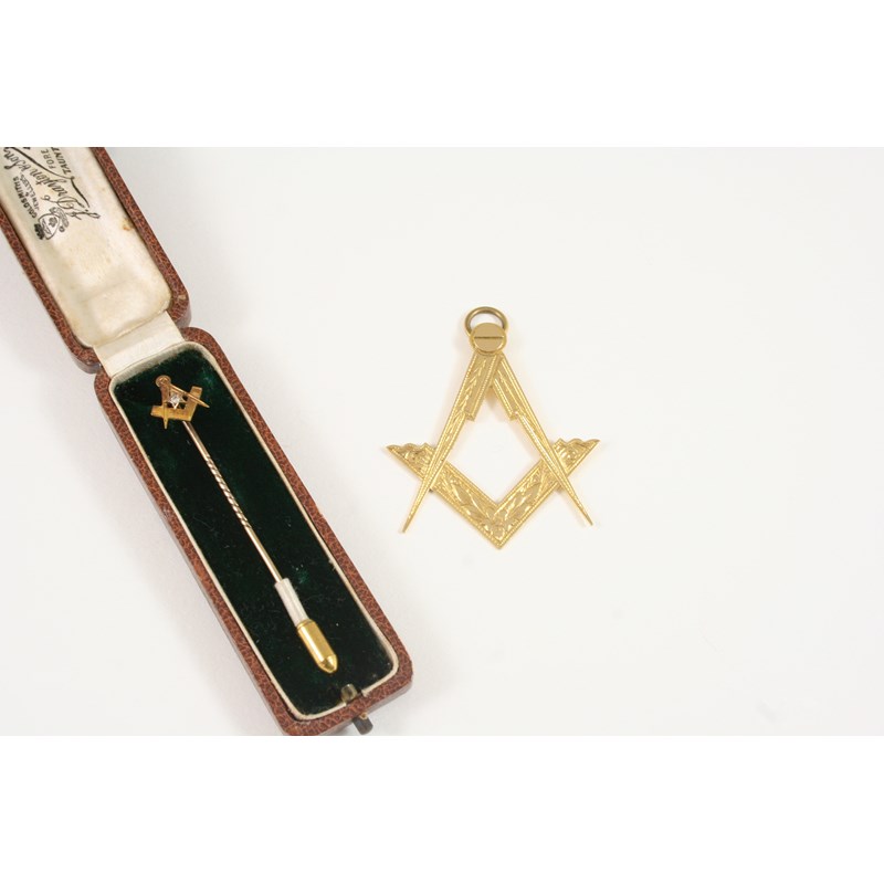 AN 18CT. GOLD MASONIC PENDANT 5cm. high, 7.6 grams, together with a 15ct. gold Masonic stick pin, centred with a small diamond.