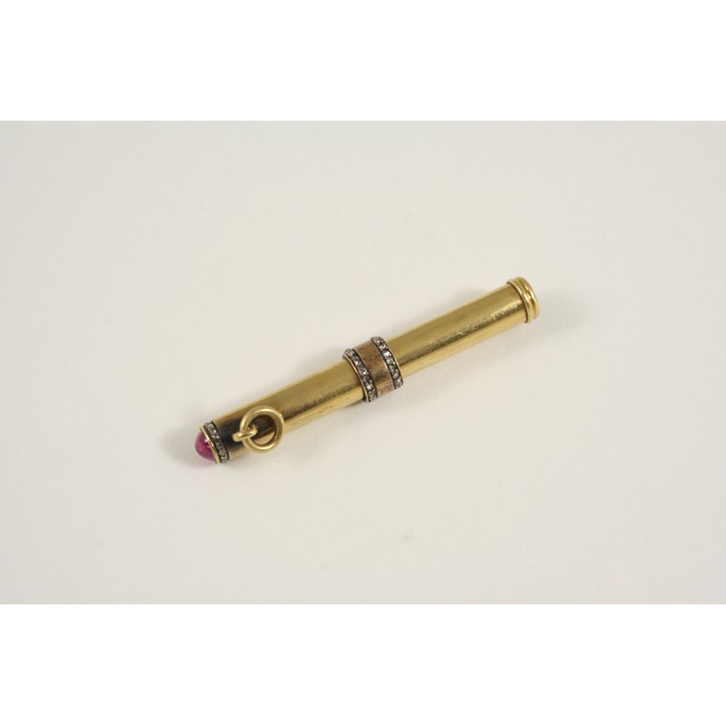 A GOLD AND GEM SET PROPELLING PENCIL the gold pencil mounted with rose-cut diamonds and with cabochon ruby terminal, 5.5cm. long, 8.9 grams.