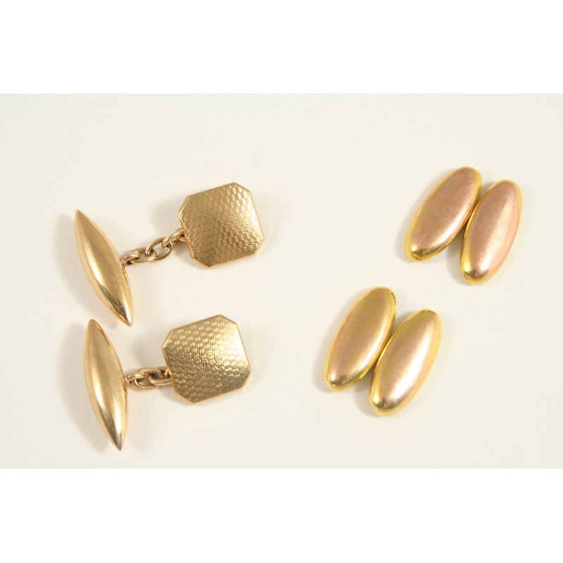 A PAIR OF 9CT. GOLD CUFFLINKS of cut cornered square design with engine turned decoration, 8.9 grams, together with another pair of 9ct. gold cufflinks of plain, lozenge shape design, 2.7 grams.