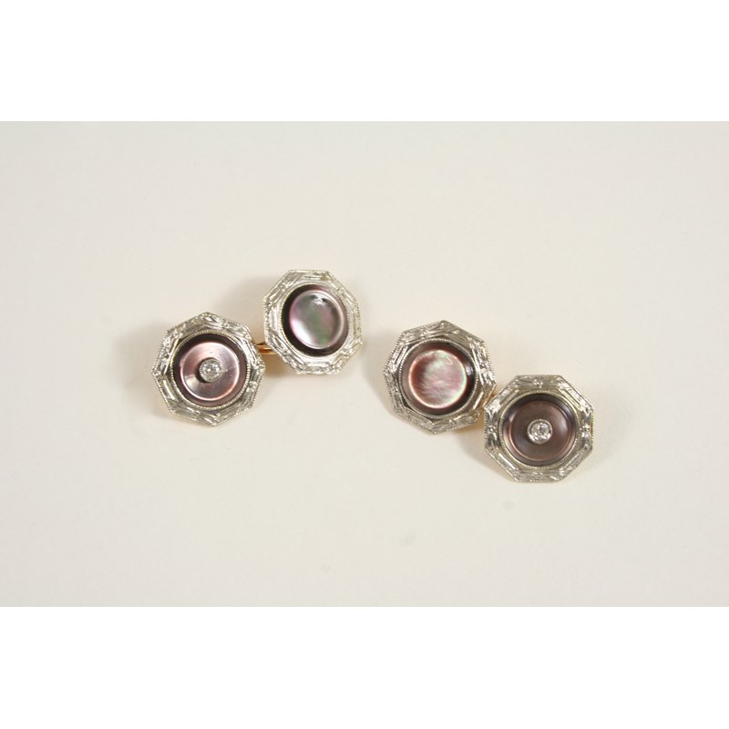 formed as circular sections of mother-of-pearl, two centred with a circular-cut diamond within a 14ct. white gold octagonal-shaped engraved mount. With box.