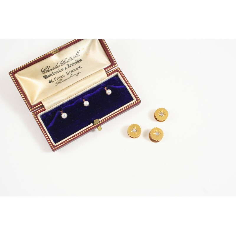 A CASED SET OF THREE DIAMOND AND GOLD DRESS STUDS each dress stud centred with a rose-cut diamond, together with a cased set of three gold and cultured pearl dress studs.