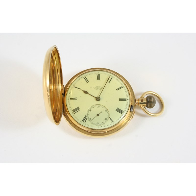 AN 18CT. GOLD FULL HUNTING CASED POCKET WATCH the white enamel dial signed Dent, 63 Cockspur St. London, with Roman numerals and subsidiary seconds dial, 50mm. dia., 92 grams.