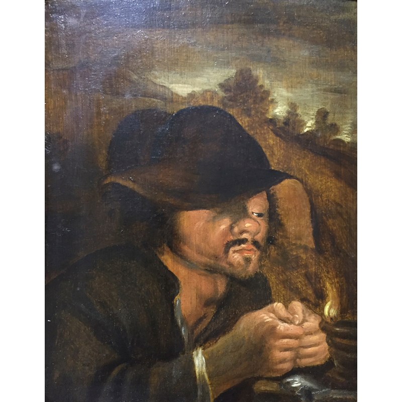 AFTER ADRIAEN BROUWER (c.1605-1638) A PEASANT CRUSHING A LOUSE Oil on panel 23.5 x 18.5cm. * Another copy is to be found in the Museum in Hannover but the prime version is believed to be lost. A further copy was sold at Christies in New York, April 19th 2018, lot 214 ( 7500) Provenance: Admiral Sir Lionel Preston, KCB; his sale, London, Christies, May 31st 1946, lot 147 as Brouwer, described as `A Man at his Toilet` (8gns)