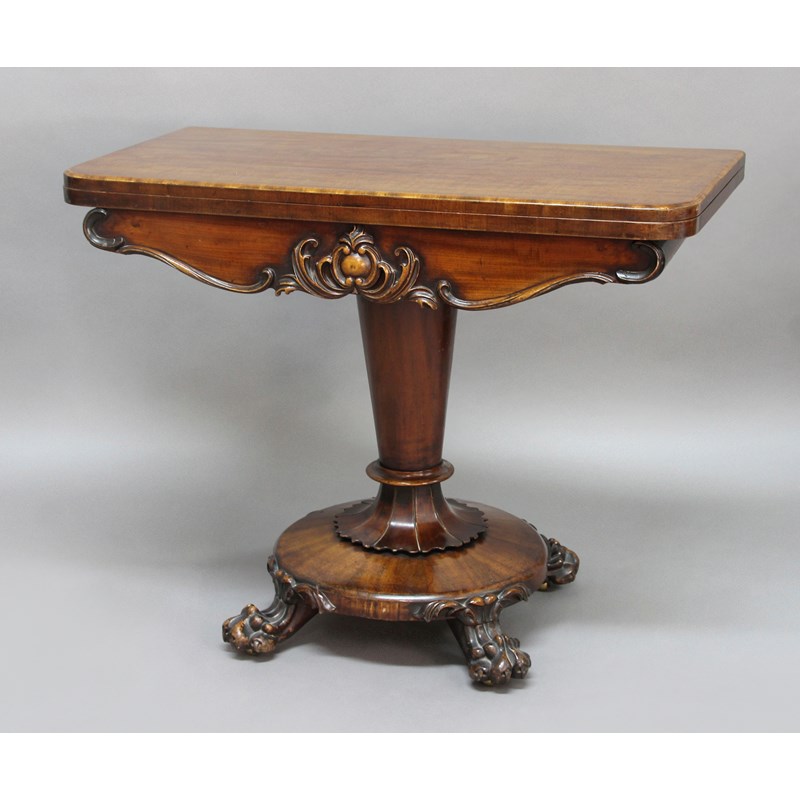 VICTORIAN MAHOGANY FOLD OUT CARD TABLE, with foliate carved frieze, tapering column and lion paw feet, height 71cm, width 90cm, depth closed 45cm
