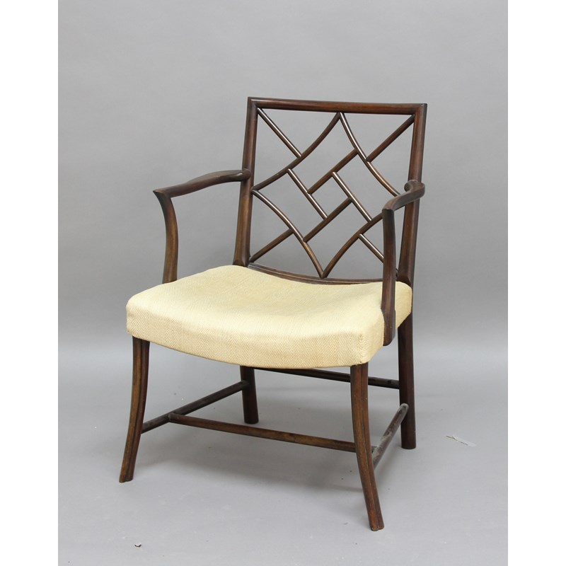 GEORGE III STYLE CHINESE CHIPPENDALE COCKPEN CHAIR, the back with a square design, scrolling arms, dished seat, moulded legs and H stretcher, height 86cm
