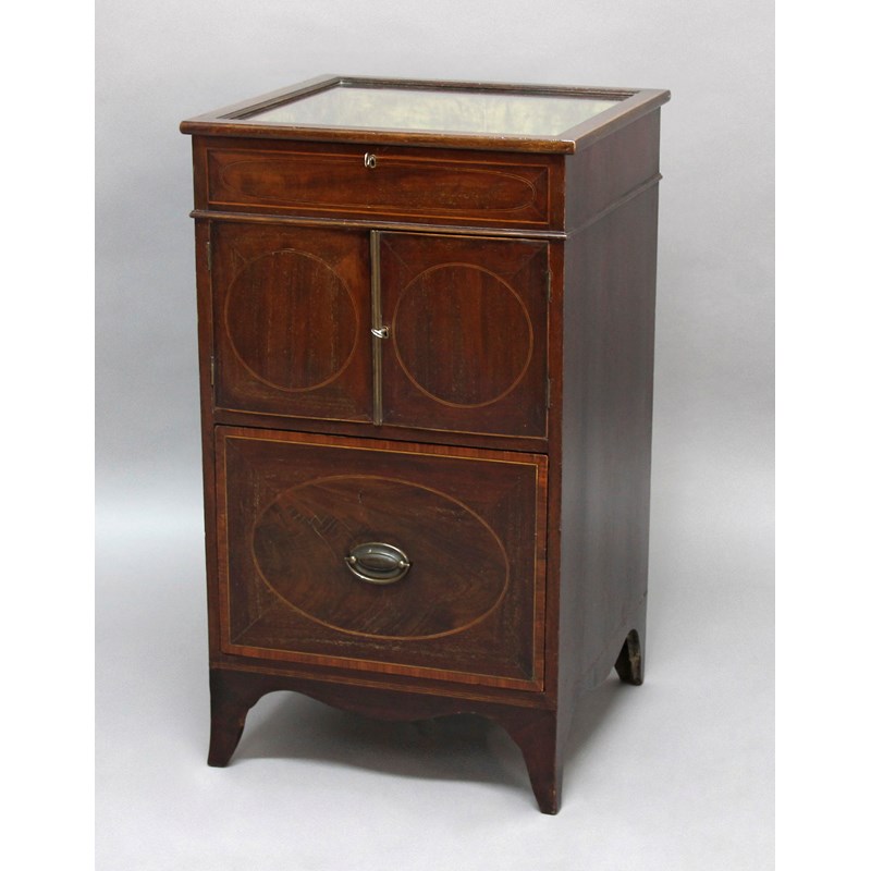 MAHOGANY AND INLAID BIJOUTERIE CABINET, 19th century, the glazed display top above cupboard doors and a drawer, height 78cm, width 45cm, depth 45cm