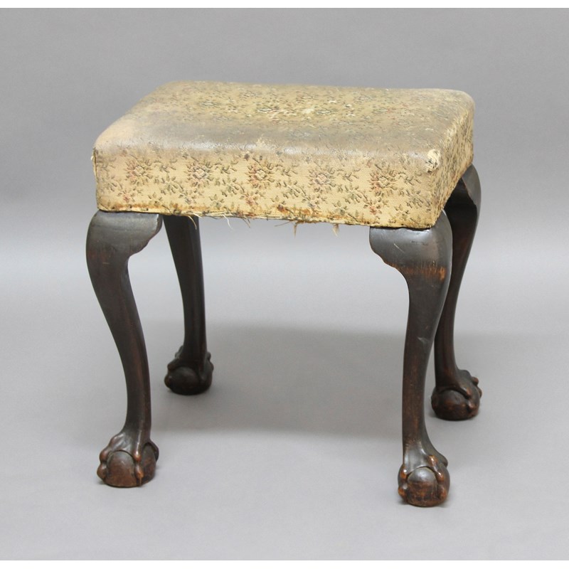 GEORGE I STYLE MAHOGANY STOOL, probably 19th century, with cabriole legs on claw on ball feet, height 50cm, width 49cm, depth 36cm