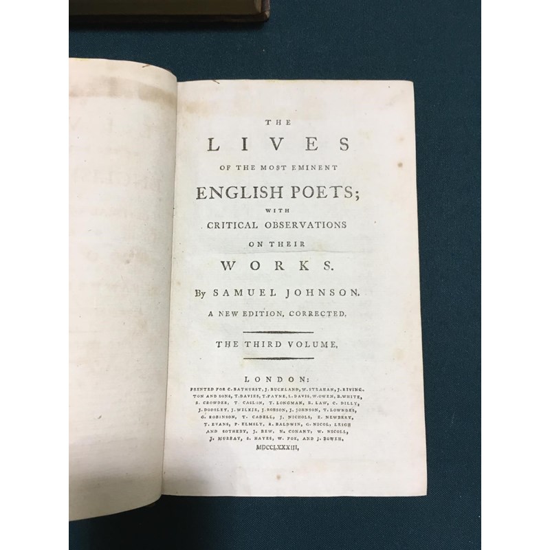 Johnson, Samuel. The Lives of the Most Eminent English Poets, 4 volumes, new edition, engraved portrait frontispiece, occasional light spotting, contemporary tree calf, spines tooled gilt, 8vo, London: G. Bathurst et al., 1783
