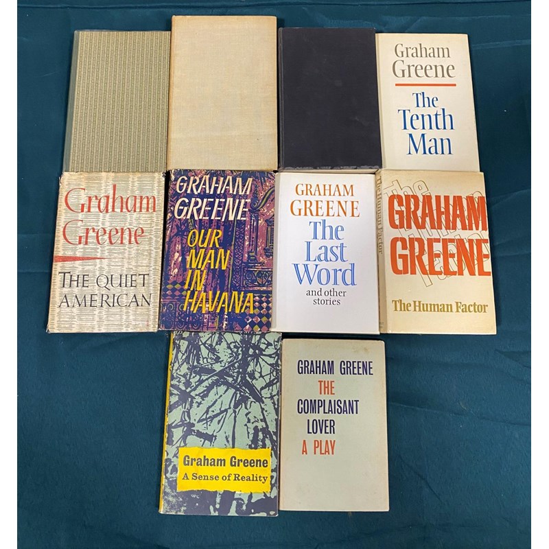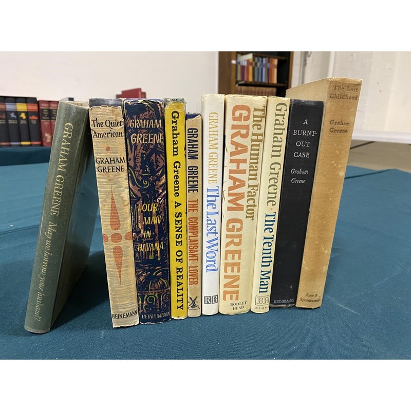 Greene, Graham. May We Borrow Your Husband?, number 230 of 500 copies, signed by Graham Greene, original boards, glassine wrapper, 8vo, London: Bodley Head, 1967; The Quiet American, first edition, original cloth, dust-jacket chipped, lightly stained and torn, 8vo, London: William Heinemann, 1955; Our Man in Havana, first edition, original cloth, dust-jacket chipped and torn, 8vo, London: Heinemann, 1958; The Complaisant Lover, first edition, original cloth, dust-jacket, 8vo, London: William Heinemann, 1959; and 5 others by the same author, 8vo (10)