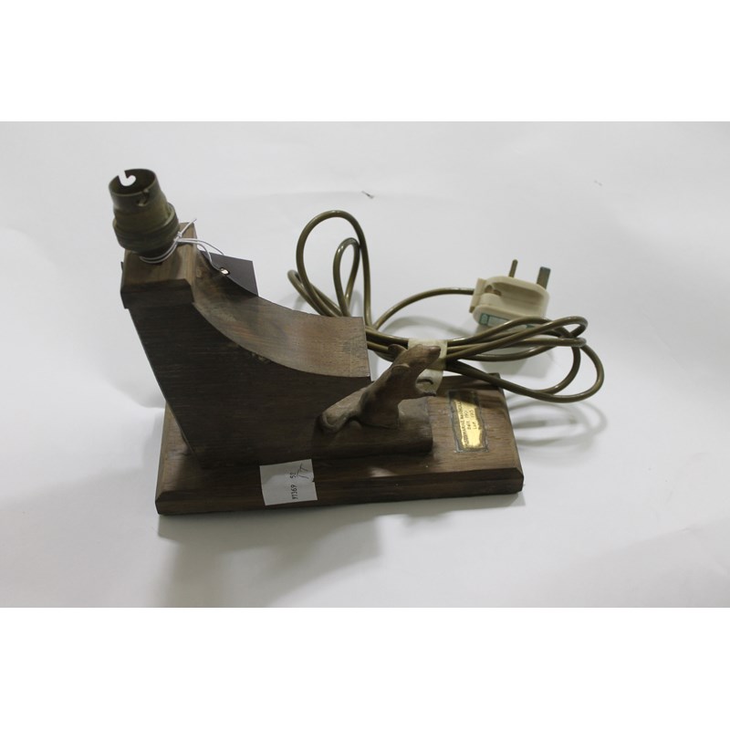 A table lamp with carved mouse decoration, with brass plaque. Carved in Teak from H M S SUBMARINE No1 Holland D. Built 1901. Lost 1913. Raised 1982.