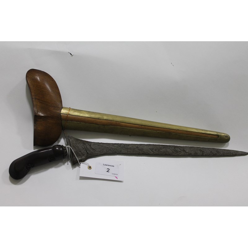 A Kris from the Java region with 12.3/4" watered steel pattern blade. Carved wooden hilt with stylised grip of hardwood, with inset designs having a brass wrapped scabbard.