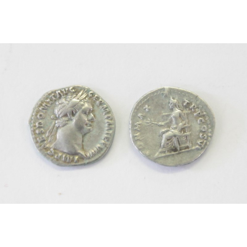 A Denarius of his youngest son Domitian, IMP CAES DOMIT AVG GERM P M TR P V111. With reverse IMP XX1 COS XV CENS P P P, Minerva with shield advancing.