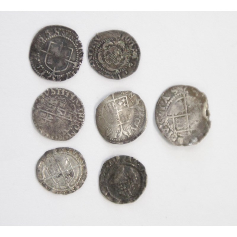 HAMMERED COINAGE. Including a James 1 Shilling, a Charles 1 Penny mint mark (A), another with unidentified mint mark. Elizabeth 1 Penny mint mark (Cross) and Three-Quarter Penny. A Halfgroat, etc