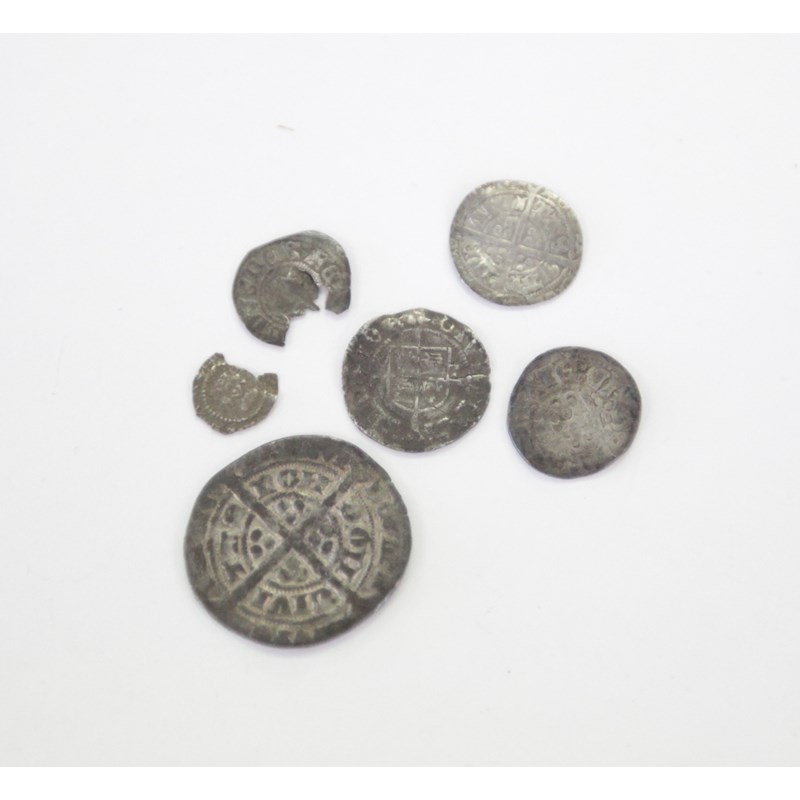 Including a Henry 111 Penny without Sceptre. A Partial Edward 111 Half Penny with London mint mark (Cross). An unidentified Quarter Penny, also a Henry V11 Halfgroat (Canterbury 2nd issue) x 2. An Edward 111 Groat London mint, pre treaty type.