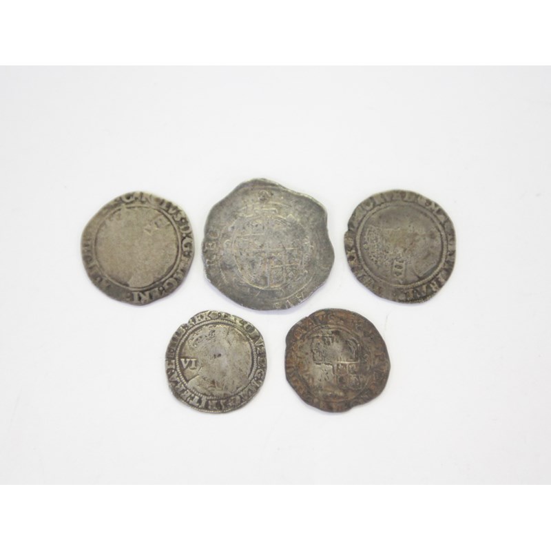 HAMMERED COINAGE. Including a James 1 Shilling with Rose mint mark, also a similar Sixpence piece. A Charles 1 Shilling C1640 with (Star) mint mark. A Charles 1 Halfcrown piece 1641-43 period, etc