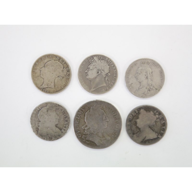 WORN COINAGE. Including a William 111 Halfcrown of 1696. Another of Queen Anne dated 1708. Victorian 1885 and 1890 dated Halfcrown pieces, also George 1111 dated 1821. A Charles 11 Halfcrown piece dated 1673;