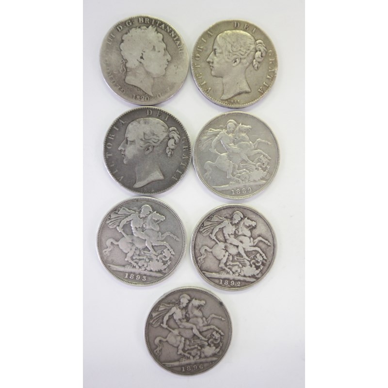CROWN PIECES. A George 111 1820 dated Crown piece. Victorian Crown pieces dated 1844-45-89-92-93-96. (7).