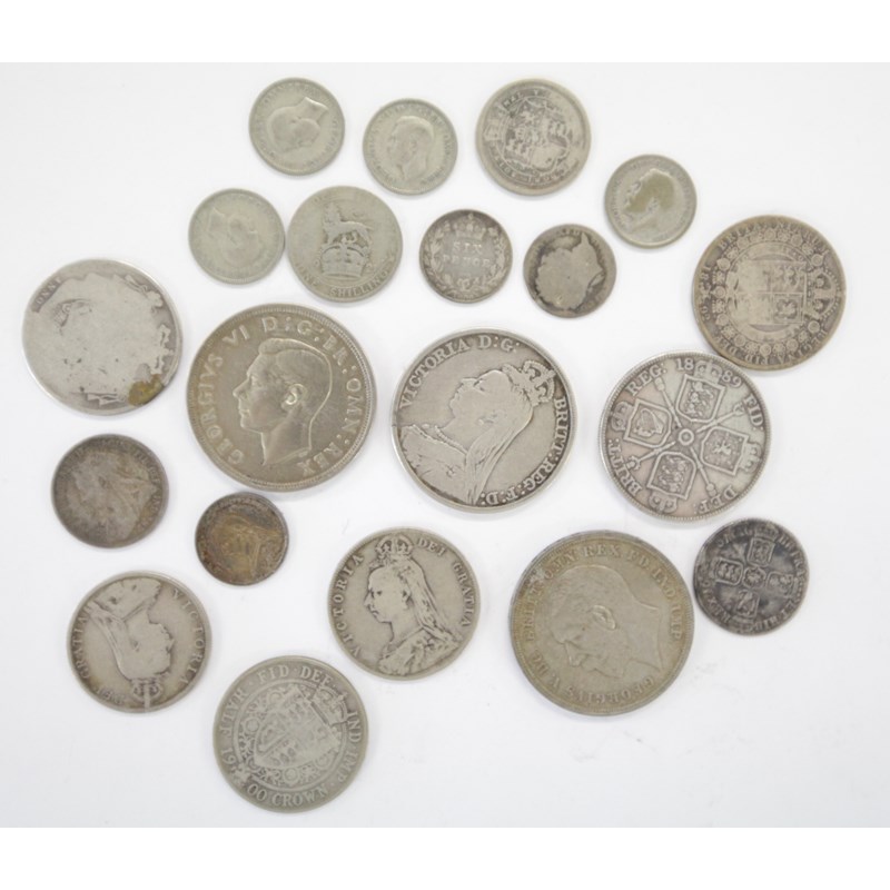 SILVER COINAGE. Including 1935 & 1937 Crown pieces, A George 1111 1821 dtaed Crown piece, Victorian Halfcrowns of 1890-1892 & 1900. A William 111 Shilling adted 1696, etc