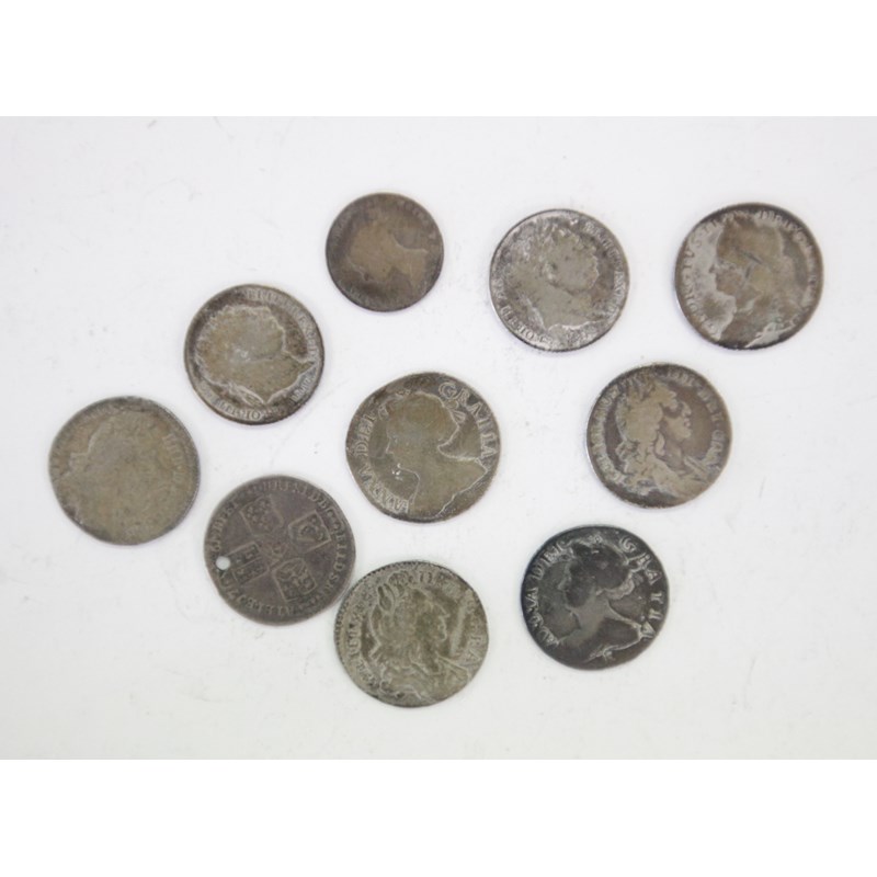 WORN SILVER COINAGE Including a William 111 Sixpence of 1696?, early Harp type. Queen Anne Sixpence dated 1711, George 11 1758, etc (10)